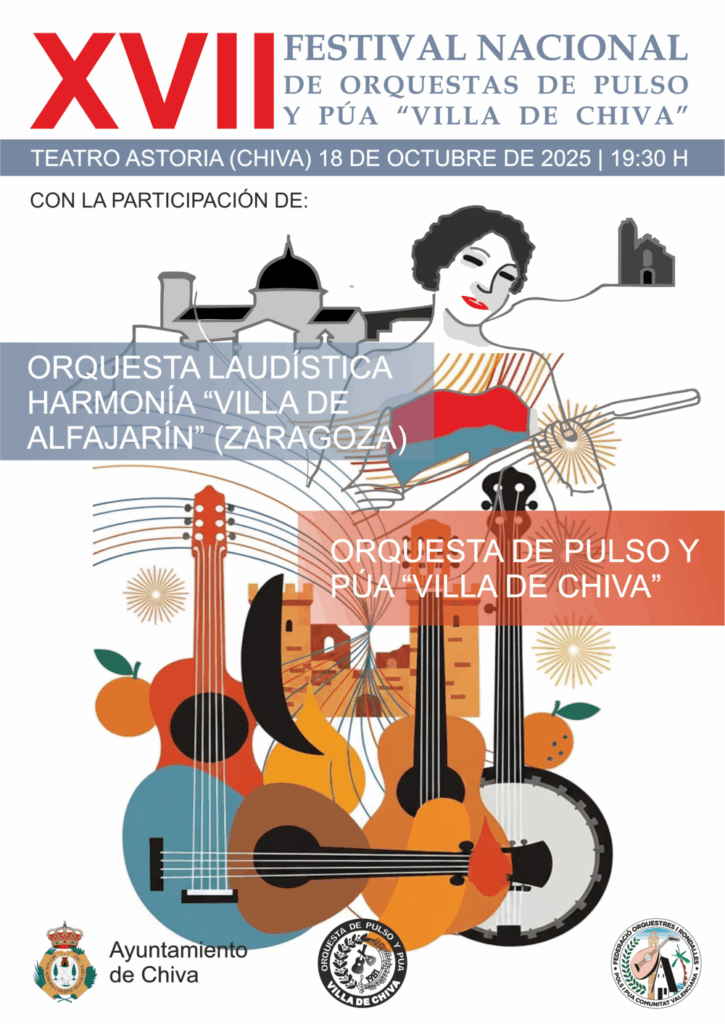 El próximo sábado 18 de octubre de 2025, el Teatro Astoria de Chiva volverá a llenarse de música y tradición con una nueva edición de nuestro festival más emblemático. A partir de las 19:30 horas, podremos disfrutar de una velada única en la que el sonido de los instrumentos de cuerda son los verdaderos protagonistas.